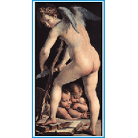 木を削り、弓を作っているのは愛の神キューピッド。彼の左足は、分厚い書物を踏んでいます。 学問を象徴する書物は理性を表すので、この寓意画は、「理性に打ち勝つ愛の力」と捉えることができます。 ただ、その力は永遠に続くのかどうか、わかりませんが…