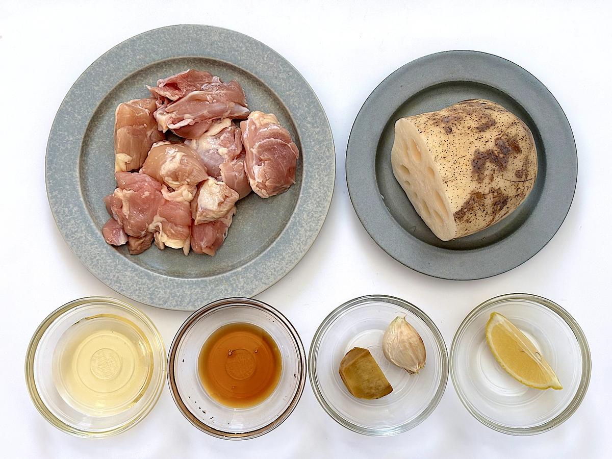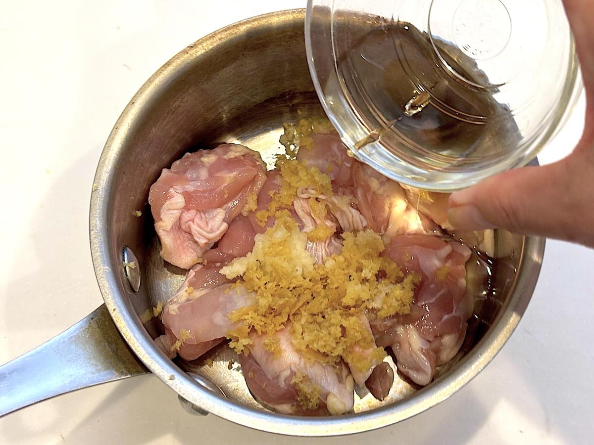 1. 鍋に食べやすい大きさに切った鶏肉と、酒、すりおろしたしょうがとにんにくを入れる。