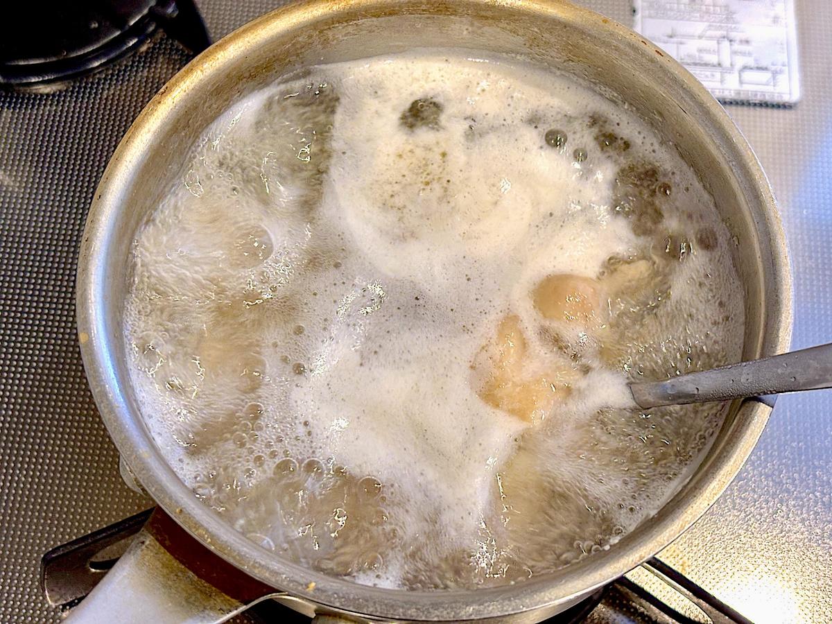 2. 水5を加えて火にかけ、煮立たせる。灰汁が出たら取りながら、鶏肉に火が通るまで煮る。