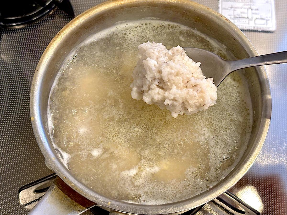 3. れんこんをすりおろして2の鍋に入れ、全体が透き通ってとろみがついたら、ナンプラーを加えて味をみて、足りなければ塩で味を調える。