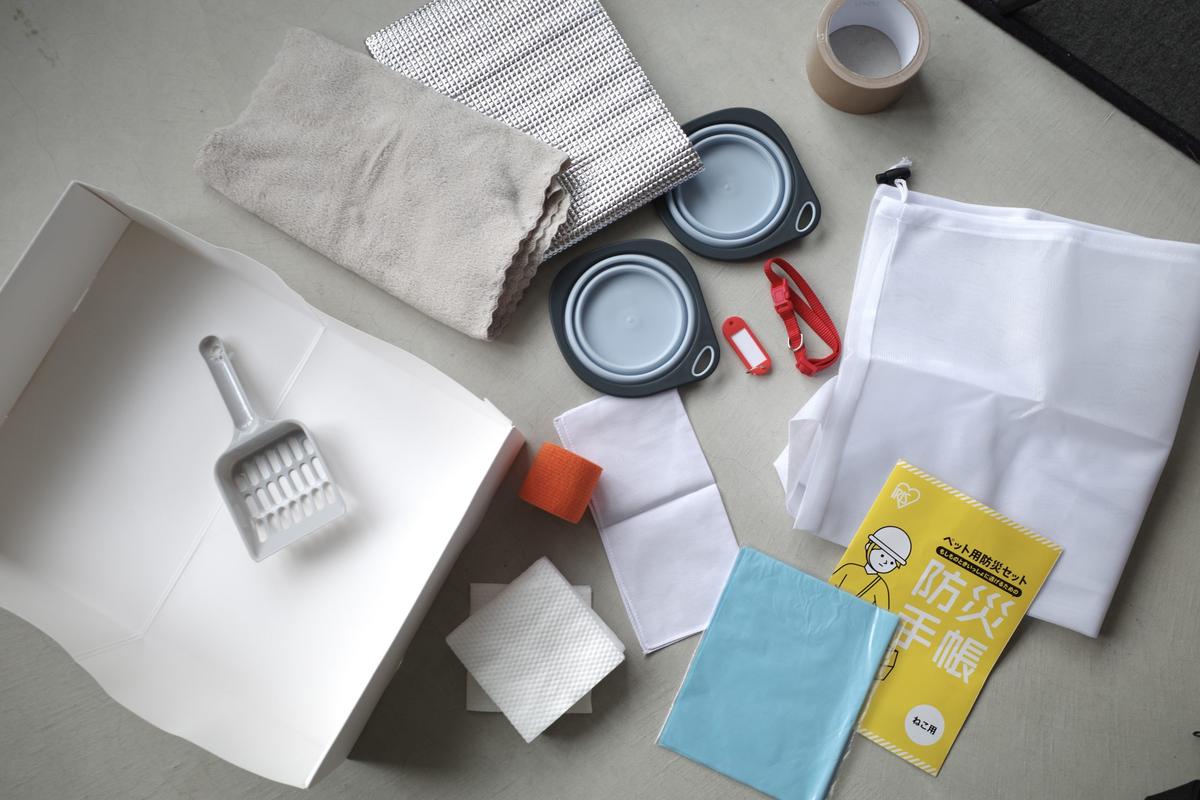 気になる中身は、ディッシュ2枚、アルミシート、折りたたみトイレ、スコップ、防臭袋20枚、迷子札や首輪、猫ネットをはじめとした食事・排泄・衛生周りをケアする15品。