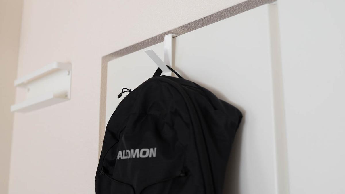 山崎実業の「ドアに引っ掛けるだけのこれ」で、置きっぱなしにしがちなリュックを毎回片付けられるようになった