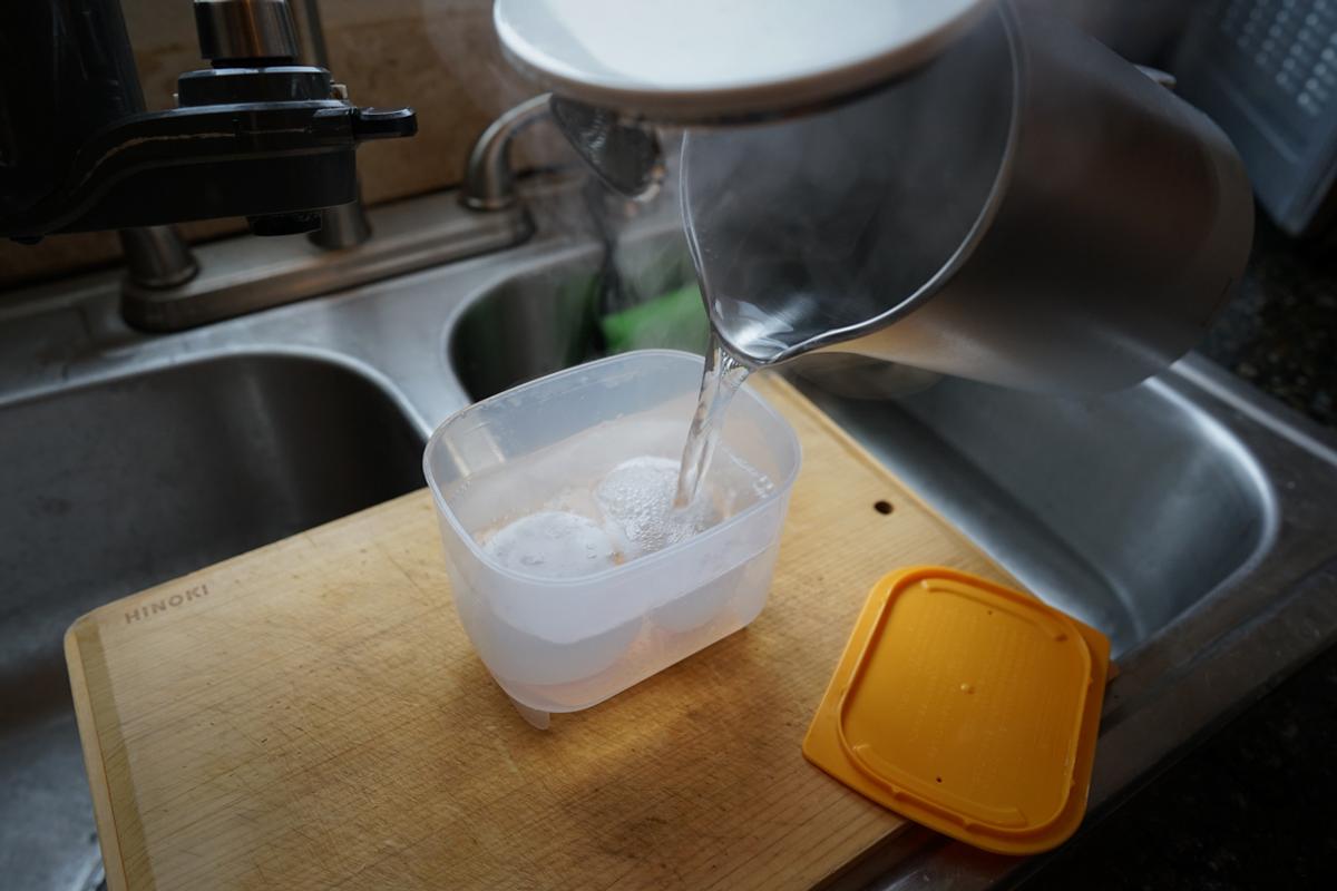 お湯の量は、本体の「お湯注ぎライン」まで入れますが、お湯の温度によっては固くなりすぎることもあります。その場合はお湯の温度や入れる量を多少調節して、自分好みの固さの温泉たまごを研究しましょう。