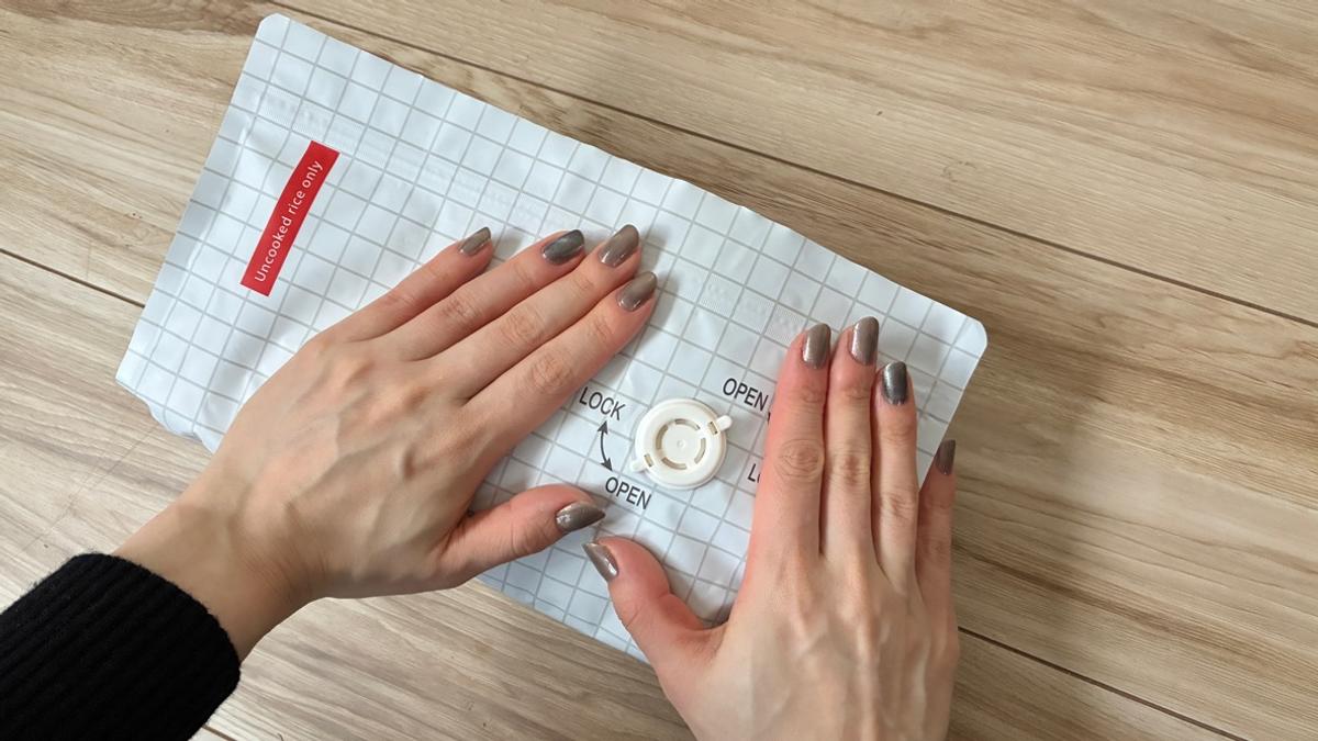 プラスチックのバルブをOPENのメモリに合わせてから余分な空気を押し出し、LOCKにスライドするだけでしっかり圧縮完了。