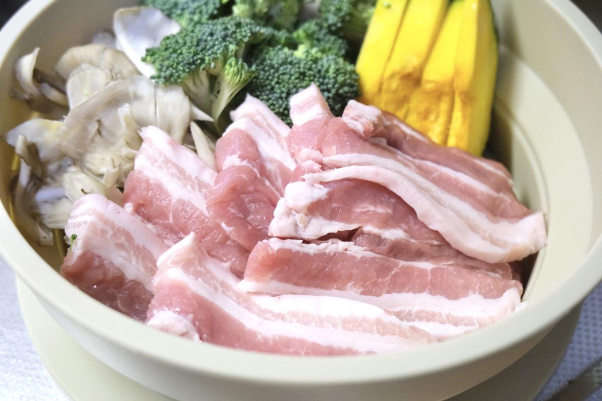 野菜の上に豚肉を重ねても余裕があり、1〜2人分なら十分なボリューム。