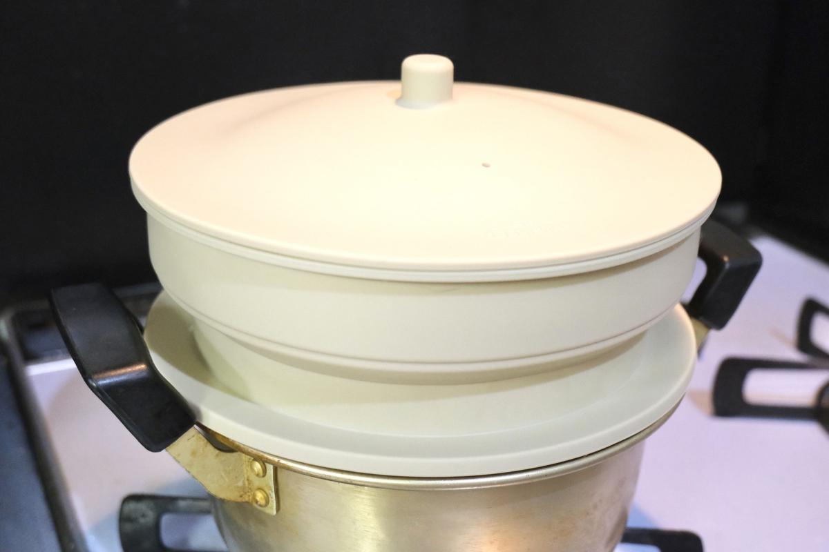 調理方法は、鍋にお湯を沸かしてフタを閉じたシリコンスチーマーをのせて蒸すだけ。