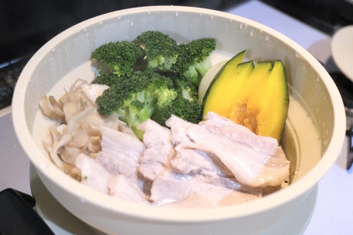 今回は、にんじんやブロッコリーなどの野菜と豚肉を一緒に蒸してみました。