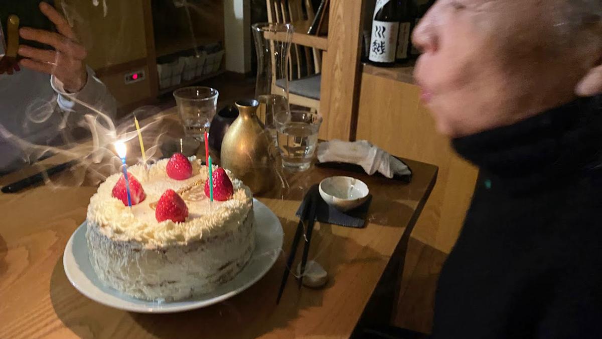 店内の明かりが消え、女将が可愛らしいケーキを持って登場【こぐれひでこの「ごはん日記」】