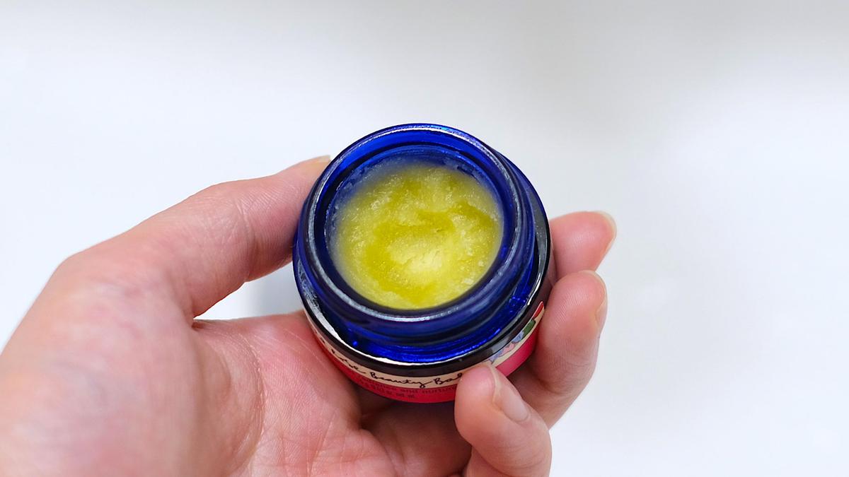 栄養がたっぷり入っていそうな黄色いバームには、ローズヒップをはじめ、シアバターやミツロウ、植物オイルを配合。見た目どおり、かなり濃密な質感です。