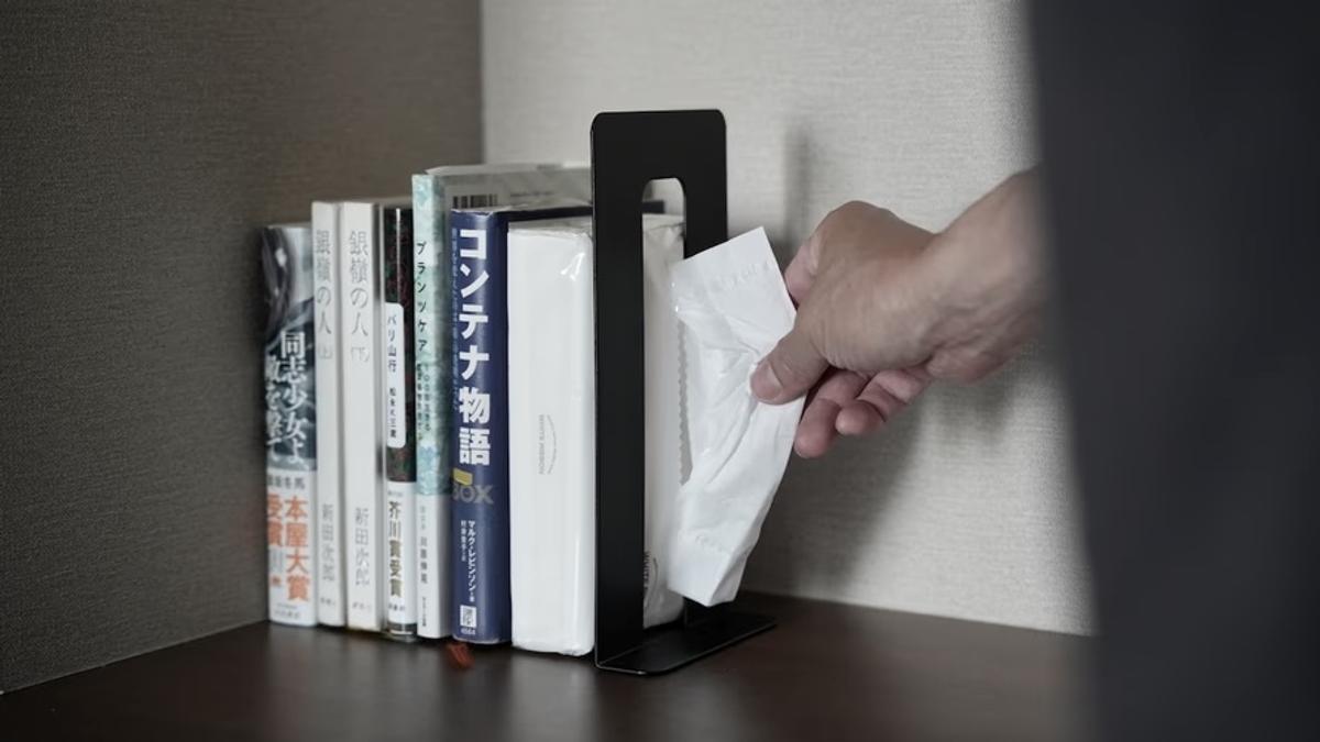 しっかりと本も倒れないように押さえてくれつつ、ティッシュもしっかり取れて実用性バッチリ。