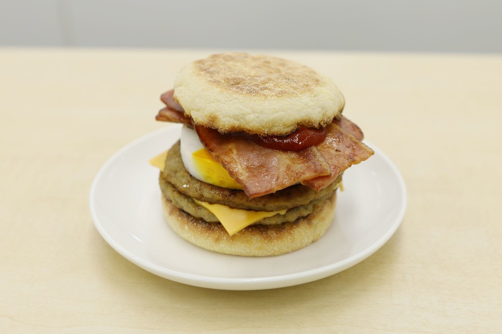 そんなTが選んだのは朝マックのメガマフィン+スモークベーコン×2だ。元々ボリューム抜群のメガマフィンにスモークベーコンが2枚も加わることで、手に持つだけでずっしりと重みを感じる。