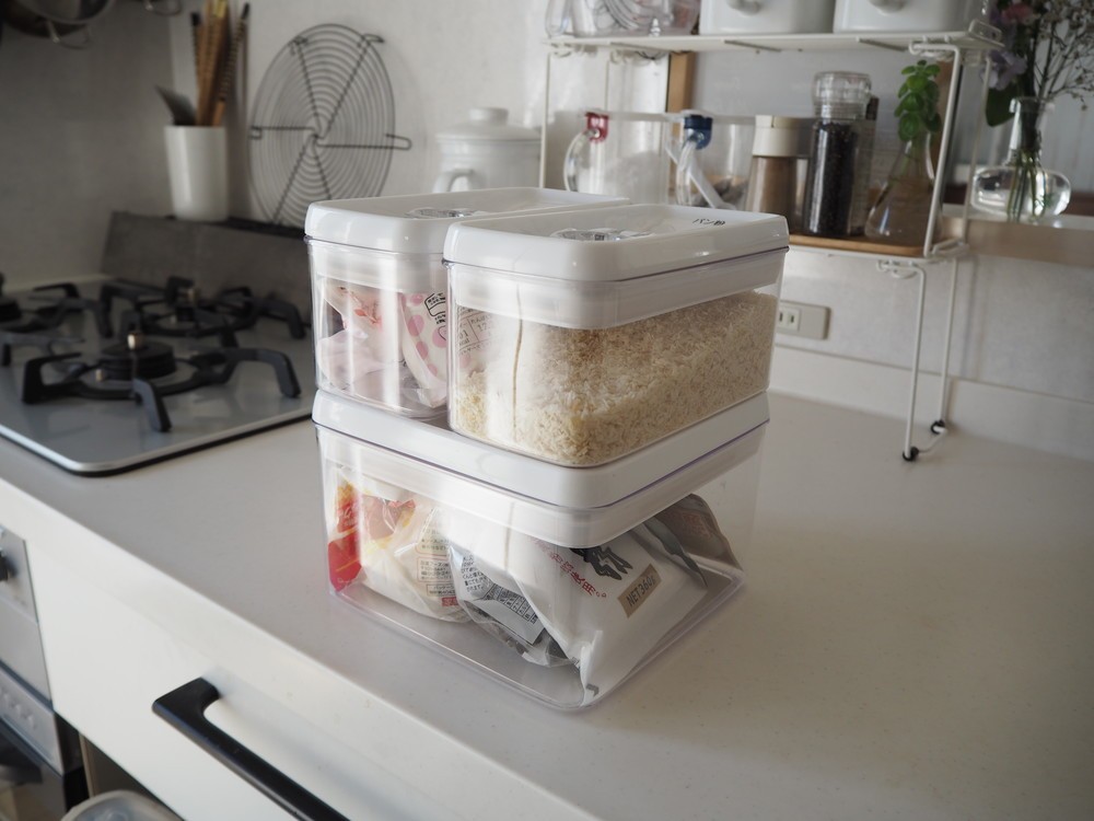 「食べ残したスナック菓子などは、これまで子ども自身にクリップや輪ゴムでとめて収納してもらっていたのですが、しっかり閉まっていなくてしけることもたびたび(笑)。でも、この保存容器は密閉性があるので、お菓子はそのままでもいいからとにかく入れておいてね!の方針に変えました。すると、容器の開け閉めも楽しいようで、前よりもきちんと片付けてくれるようになりました。子どもがうっかり落としても割れにくい素材なのもいいですね」