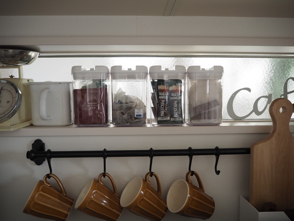 キッチンの窓辺には、保存容器に入れたお茶やコーヒーを並べていました。眺めながら、「どれを飲もうかな〜?」と選ぶのも楽しいひとときだそう。