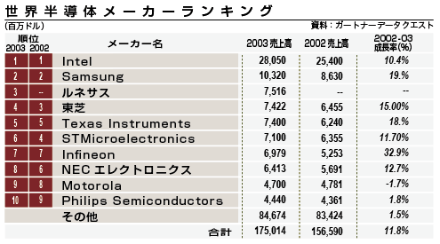 一方、高度なデータ処理を行う「システムLSI」という半導体に関しては、日立と三菱電機が合弁会社「ルネサステクノロジ」を2003年に設立した。半導体の世界ランキングではベスト3に入る大企業だ。NECはシステムLSIなどの高付加価値の半導体部門を02年に分社化し、「NECエレクトロニクス」とした。これ以外の富士通と東芝、ソニー、松下電器産業は社内の事業部でシステムLSIを生産している。富士通はこのほか、携帯電話などに使う「フラッシュメモリー」に関して、米AMDとの間で共同出資会社「FASL LLC」を設立し、フラッシュメモリーの生産を統合した。