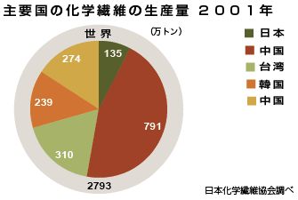 日本国内の繊維産業は大きな転機を迎えている。2003年の化学繊維生産高は、前年比7.1%減の131.6万トンとなった。合成繊維は115.7万トンで同7.7%減、セルロース繊維は15.9万トンの同2.1%減である。合成繊維の国内生産量はピークの97年に比べて4分の3にまで縮小した。大幅縮小の理由は中国からの低価格製品の輸入増加と日本企業の中国への生産拠点のシフトである。