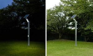 シャープが発売するソーラー照明灯「LN-L19ZA」。夜間点灯時(左)と発電時(右)シャープは、ソーラー照明灯「LN-L19ZA」を2006年10月5日から発売する。日中に太陽光で発電した電気を蓄電池に蓄え、夜間にそのエネルギーのみで発光する。新開発の高輝度・長寿命白色LEDランプを採用し、地表平均照度3ルクスとLED屋外照明灯として業界No.1の明るさも実現した。オープン価格。