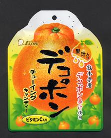 ライオン菓子が発売する「デコポンチューイングキャンディー」ライオン菓子は、「デコポンチューイングキャンディー」を2006年10月23日に全国で発売する。高級柑橘「デコポン」の果汁を使用したほか、キャンディのかたちも頭がぽっこりしたデコポン型にした。1粒にレモン1個分のビタミンC(20mg)が配合されている。希望小売価格は120円(税込)。