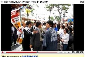 神奈川11区から衆院選に出馬する、小泉純一郎元首相の次男・進次郎氏。地元祭り会場を遊説中に対立候補の民主・横粂(よこくめ)勝仁氏(27)が挨拶したが、それを無視するかのような態度をとる動画が2009年5月24日、YouTubeにアップされた。これまでに約35万回再生され、「失礼にも程がある」等のコメントが2500件以上投稿されている。