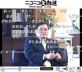 11時42分。亀井担当相が大臣室に戻り、カメラの前のソファに座ると、ニコ動の画面は「キタ――」「おおおおおおおう」「しーずかちゃーん」といったユーザーの歓迎コメントで埋まった。始まってしばらくは音量レベルが小さくて、声がうまく聞き取れない。ユーザーが不満のコメントを投稿すると現場スタッフがすぐに対応。ネットならではの双方向性も生かしながら、中継は進行した。