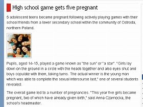 それによると、ポーランド北部のある中学校で、「太陽」あるいは「星」と呼ばれるゲームが行われた。女子生徒たちは、頭が中心部に来るよう円形になって横たわり、目を閉じたところに、男子生徒たちが交互に肉体関係を持つ。そして、最後まで耐えられた男子生徒が勝者になるというものだ。