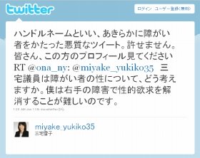 ツイッターで民主党の三宅雪子衆院議員(45)が、障害者の性についてのいたずらとみられる質問に激怒している。それなら無視すべきではとのフォロワーらの指摘にも、三宅議員は、「抗議したかった」というのだ。