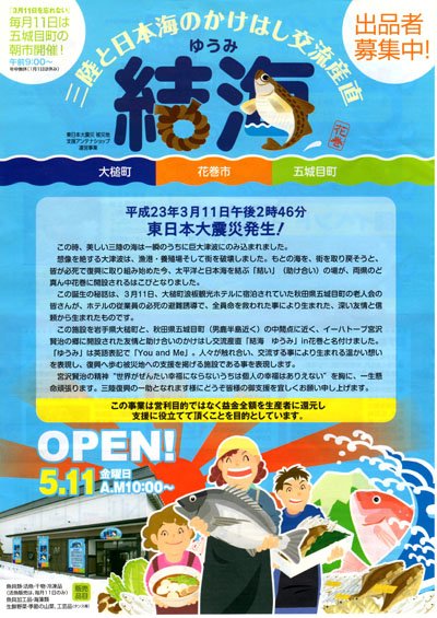 「いわてゆいっこ花巻」も運営に全面協力することにしており、店内の一角に「ゆいっこブース」を設置。東日本大震災の記録写真や映像がいつでも見れる「アーカイブコーナー」や語り部コーナー、手内職の作業場などを設けることを計画している。「東京へ、中央へ」―。日本はこれまで背骨を鍛えることだけに夢中になり、その間にあばら骨がすっかり貧弱になってしまった。「健全な肉体も背骨だけでは保てない。結海こそが日本のあばら骨たらん」とスタッフは張り切っている。