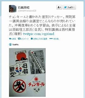 「チョンキール」と書かれた韓国人差別のステッカーが衆院議員会館で売られていた――。朝日新聞記者がこうツイートし、ネット上でステッカー販売に批判が相次いでいる。市民団体の会議室利用に協力した自民党議員側は、販売との関係を否定しており、困惑している様子だ。