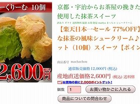 やり玉に挙げられた1つが、京都・宇治の抹茶を使ったシュークリームだ。ある北海道の出店業者のサイトでは、10個入りの通常販売価格を1万2000円に設定し、「楽天日本一セール 77%OFF」とうたった。そこでは、産地直送価格として、2600円という値引き価格が表示されている。