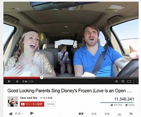 「とびら開けて」はヒロインのアナとハンス王子が意気投合し結婚を誓うデュエット曲で、男女の甘い掛け合いが楽しめる。中でも美男美女のSam&Nia夫妻が3月10日に投稿した作品は、再生回数が1100万回を超えるほどの人気ぶりだ。車を運転しながら撮影しているとは思えないほどの出来ばえで、キャラクターになりきって、台詞のタイミング、表情、身振りまで完璧に表現している。夫が演技に熱が入ってハンドルから手を放したり、後部座席の子供が退屈そうにしていたりといった部分も視聴者に受けているようだ。