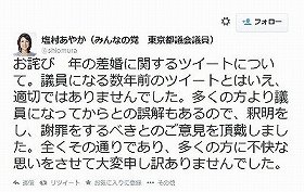 これらの発言がネット上で問題視されると、塩村都議は2014年6月28日にツイッターで「年の差婚に関するツイートについて」と書き、「議員になる数年前のツイートとはいえ、適切ではありませんでした。多くの方より議員になってからとの誤解もあるので、釈明をし、謝罪をするべきとのご意見を頂戴しました。全くその通りであり、多くの方に不快な思いをさせて大変申し訳ありませんでした」と謝罪コメントを投稿した。