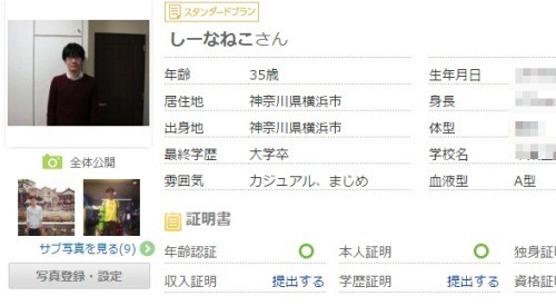 次にプロフィール。趣味や出身地といった項目は一般的なSNSにもあるが、婚活サイトだけあって、学歴や年収という生々しい項目も。ざわざわする。そう、私はコンプレックスの塊だから。