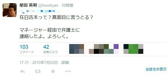 星田さんのツイッターへの返信の中で、「在日吉本」と表記したネットユーザーがおり、これに対し、法的措置を取る構えを見せている。一方で、星田さんの対応を批判するつぶやきもあり、注目を集めている。