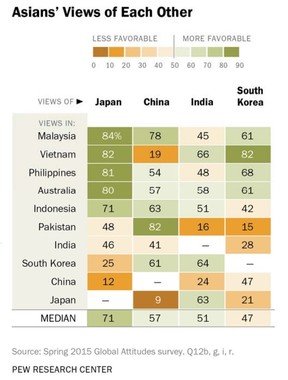 日本を好意的にみている人の割合を国別に見ると、マレーシア84%、ベトナム82%、フィリピン81%、オーストラリア80%、インドネシア71%。東南アジア諸国での好感度は総じて高い。パキスタン、インドはそれぞれ48%と46%で、ピュー研究所の発表では「インド人とパキスタン人は、3分の1以上が日本に対する意見を持っていないと話している」としている。