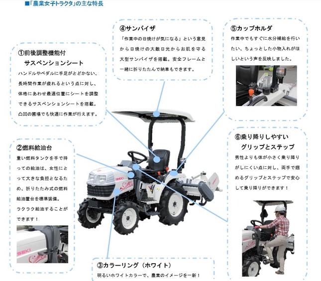 農業機械メーカー、井関農機が開発したのは、白を基調としたシンプルで都会的なデザインが特色のトラクターだ。日焼け防止のボードを設置するなど、若い女性たちの声を取り入れている。ダイハツはピンクやオレンジなどカラフルなボディーカラーをそろえた軽トラックを開発。紫外線カット機能をつけた窓ガラスもつけられるようにしている。「従来の男性目線からは考えられないようなトラック」と発売当初は驚きの声が上がり、その後の販売は好調だ。