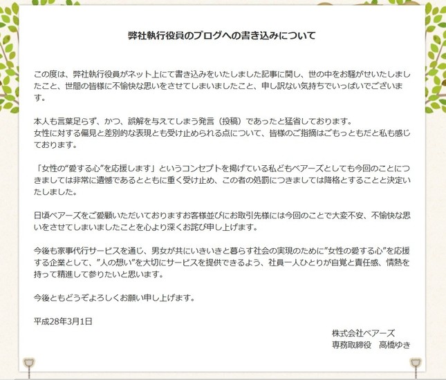 家事代行業ベアーズの執行役員が自分の経験をもとにブログで、女性社員の扱い方について論じたところ、「女性蔑視だ」などと批判が殺到し「炎上」する騒ぎになり、ベアーズは2016年3月1日付けで公式ホームページに謝罪文を掲載し、この執行役員を降格させたと発表した。