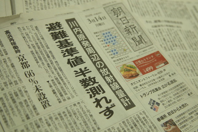 などと川内原発の再稼働を非難していた。14日の紙面では3面にも「避難どう判断、住民に不安 原発周辺、線量測定の態勢不十分」と題した関連記事を載せ、15日にも社説で「放射線量計 事故の教訓はどこへ」と題して、