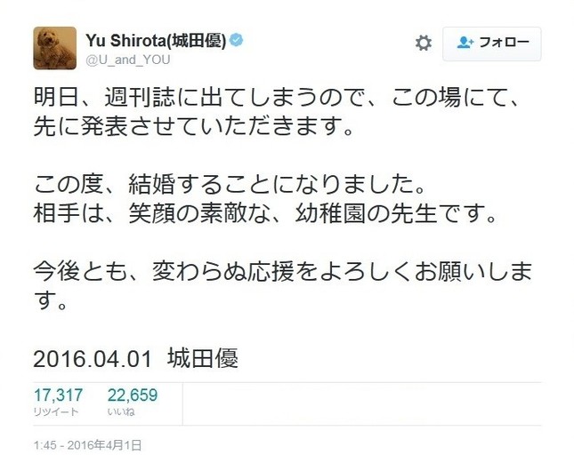 「明日、週刊誌に出てしまうので、この場にて、先に発表させていただきます。 この度、結婚することになりました。 相手は、笑顔の素敵な、幼稚園の先生です。 今後とも、変わらぬ応援をよろしくお願いします。 2016.04.01 城田優」