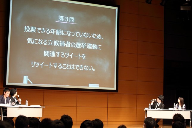 イベントでは、ラジオ番組で司会を務める「とーやま校長」ことグランジの遠山大輔さん(36)と「あしざわ教頭」ことパップコーンの大桶純一さん(35)らが選挙の仕組みを解説し、会場に集まった高校生に○×クイズを出して、広瀬さんが解説するなどした。