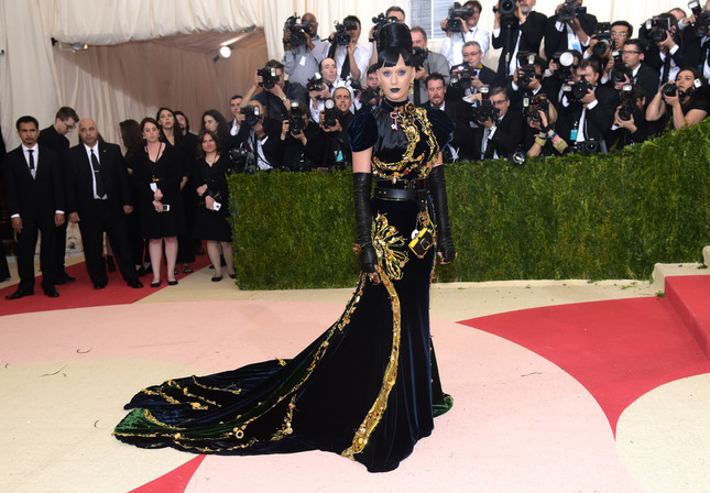 ふたりは2016年5月2日(現地時間)、ニューヨークで開催されたファッションイベント「Met Gala(メットガラ)」に登場。外国メディアが報じたケイティさんの写真を見ると、確かに腰元には、ボールチェーンにつながれた、白く丸い物体がある。同様に、胸に丸い物体を着けたオーランドさんの写真も流れている。