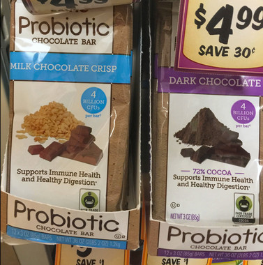 本当に米国人はチョコレートが好きなんだなあと思うのは、健康志向でつくられている製品の味に、チョコレート系の味があることです。例えば、エナジーバーにはチョコレートチップ味、ブラウニー味、ホワイトチョコレート味があります。日本人である私からしてみれば、チョコレートなんてカロリーが高いのだから、健康志向と銘打つ時点で、チョコレート系の味は除外するもの。ところが、先日オーガニック系スーパーで見つけた「Probiotic」というチョコレートバーは、免疫系強化と整腸作用が売りの健康系チョコレートでした。