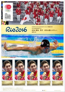 日本郵便は2016年8月8日、リオデジャネイロ五輪の男子競泳・400メートル個人メドレーで金メダルを獲得した萩野公介選手の記念切手シートを発売した。82円切手5枚組みで、税込み1400円。