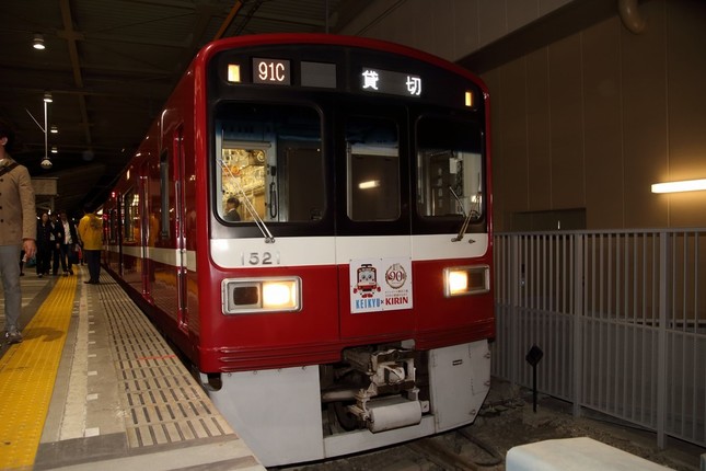 「ビール電車」は横浜駅を出発し、キリンビール横浜工場の最寄り駅の生麦駅で、工場長ができたてのビールが入った樽を電車に載せた。電車はそのまま京急川崎駅に向かい。大師線(京急川崎~小島新田)を2往復。乗客は崎陽軒のオリジナル弁当をつまんだり、ホームから珍しそうに電車を眺める人に手を振ったりしながら、2時間の旅を楽しんでいた。