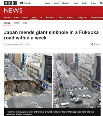 博多駅近くで起きた道路大規模陥没事故は、海外でも驚きをもって受け止めている。駅前の道路に巨大な穴が空くという光景にインパクトがあるのはもちろん、わずか1週間で仮復旧が完了し、通行が再開されたことへの評価も高い。