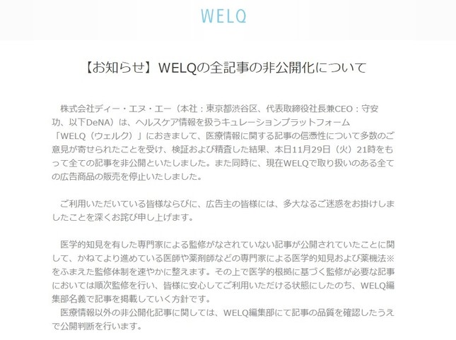 DeNAは16年11月29日、WELQに公開されていたすべての記事を非公開とし、販売されていた広告商品の取り扱いを停止した。