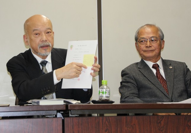 読売側との契約書を紹介する中里英章社長(左)