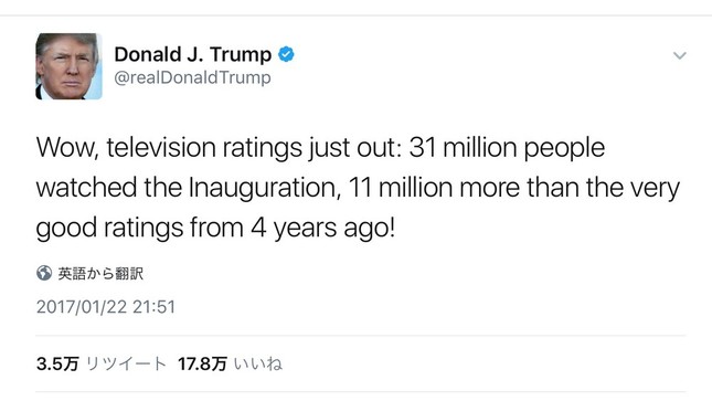 トランプ氏は、ツイッターでオバマ前大統領の「4年前」の就任式と比較すれば今回の就任式の方が視聴者数は多いと主張したが、「8年前」と比べるとはるかに少ないことには言及しなかった。トランプ氏のツイッター担当者が過去に「ウソニュース」を拡散してきたとも報じられており、「うそつき」をめぐるトランプ氏とメディアの攻防が激化しそうだ。