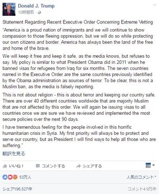 Facebookのマーク・ザッカーバーグCEO(32)も自身のFacebookページに、「私たちは避難民と助けを必要とする人々に門戸を開くべきです」と、投稿。自身の祖父母や妻であるプリシラ氏の両親が移民であったことを説明。「米国は移民の国であり、私たちはそれを誇りに思うべきである」と強調した。