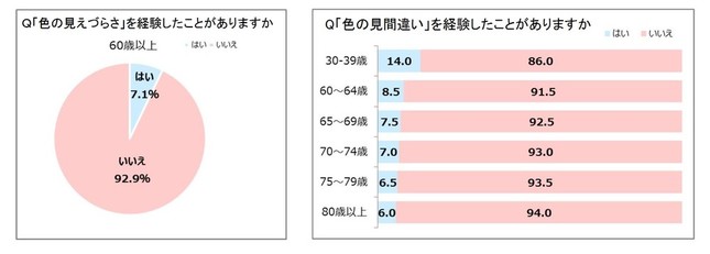 加齢により眼の機能は衰えるが、60歳以上の93%が「色の見えづらさ」や「色の見間違い」を「感じたことがない」と回答。70代、80代と上がるごとにその回答が多くなることが分かった。「色の見えづらさ」「色の見間違い」に対して高齢者の自覚や実感が低くなる傾向がうかがえた。
