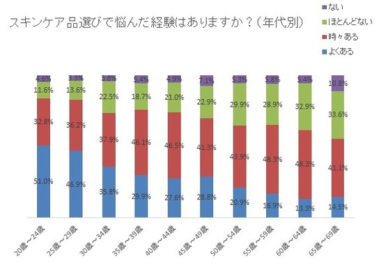 年齢別では、20歳~24歳が約84%と最も高く、65歳~69歳では約56%だった。年齢が高くなるにつれて悩む人は減る傾向にあり、自分の肌やスキンケア品の知識が少ない、若い年代ほど自分自身でスキンケア品を選ぶことが難しいようだ。