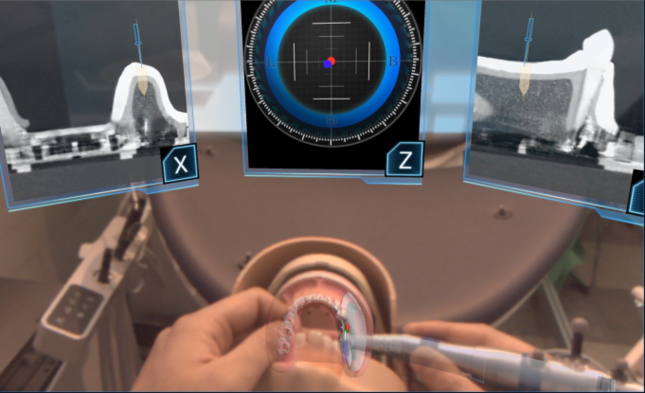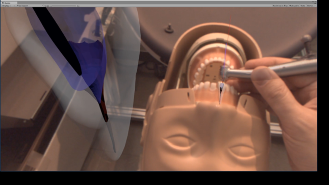 具体的には施術者がヘッドマウントディスプレー(頭部に被る形状にディスプレー)を装着し、搭載されたステレオカメラで患者(実習模型)の口腔内や患部の映像を捉える。この映像データに、肉眼では確認できない患部の神経や血管の位置や形状などの情報をCG画像として重ね、傷つけてはいけない部分を視認しながら治療することができるという。